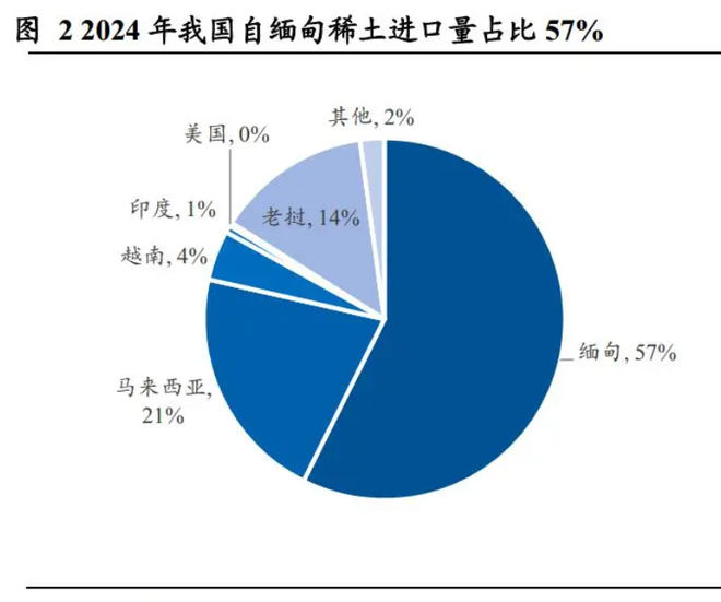 缅甸也是我国最大的稀土进口来源国。根据国泰君安研报,2024年我国全口径进口稀土总量约7.73万吨,同比下降30%;其中自缅甸进口量4.4万吨,占比57%。