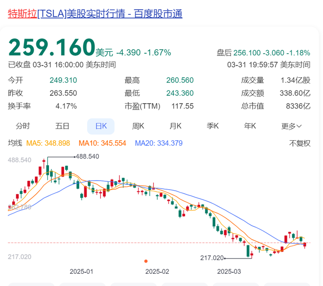 去年11月特朗普宣布胜选后,特斯拉股价曾一路高歌猛进,从251美元暴涨至最高超过488美元。然而1月20日特朗普正式上任后,特斯拉股价却一泻千里,已跌超40%,较去年高点更是接近腰斩,已基本跌回特朗普胜选前。其总市值蒸发超过7000亿美元,马斯克身家缩水超1000亿美元(约合人民币7200亿元)。
