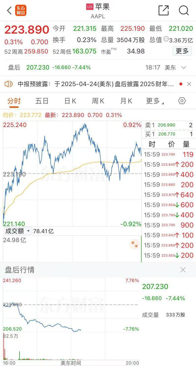 苹果公司美股盘后大跌7.44%,特斯拉跌近6%