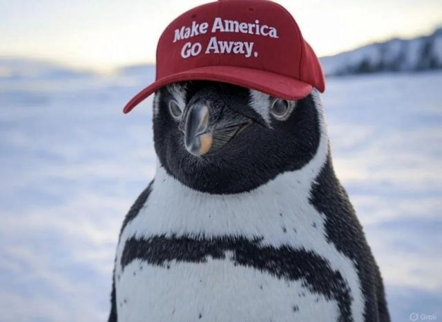 梗图背景:特朗普标志性红帽上写着“Make America Great Again”,缩写为“MAGA”,意思是“让美国再次伟大”。这只企鹅头戴的小红帽上面写着“Make America Go Away”,缩写同样为“MAGA”,意思却是“让美国走远点”