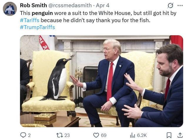 特朗普的对等关税”收到企鹅头上据新华社报道,美国总统特朗普2日宣布对贸易伙伴开征“对等关税”,就连偏远的无人岛——那些只... 特朗普的对等关税”收到企鹅头上