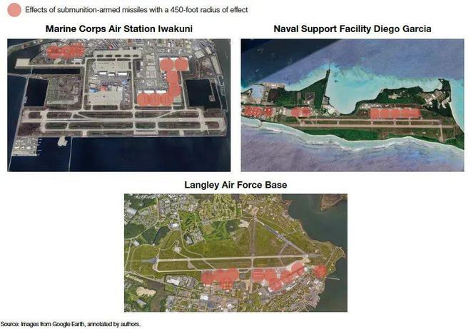 让美媒担心的是,迭戈加西亚并没有加固机库,昂贵先进但脆弱的B-2轰炸机,很可能毁于一架低端无人机之手——俄乌冲突中已经不断证明了战略轰炸机在无人机袭击面前的脆弱性。更糟糕的是,美国智库哈德逊研究所今年1月发布的评估报告显示,可能只需10枚携带集束弹药的导弹(每枚导弹攻击范围覆盖直径450英尺的区域),就可以摧毁迭戈加西亚露天停放的所有战机、关键的燃料库以及基础设施。其中只要有5枚导弹命中,就能摧毁或重创停放在停机坪上的所有战机——目前B-2就是停放在这里……
