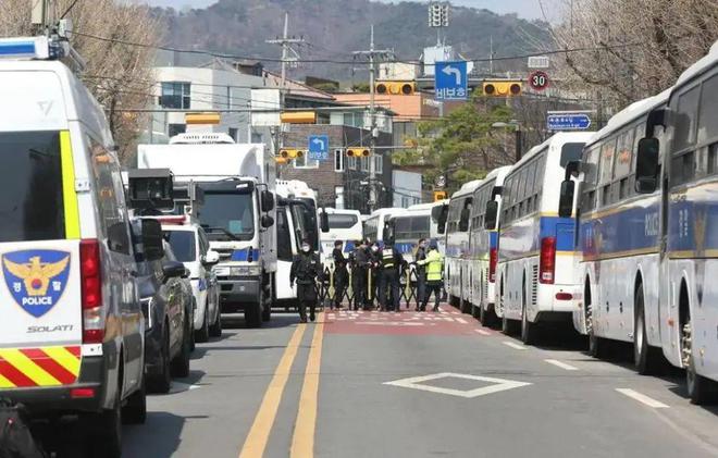 4月3日,在韩国首尔,警察在韩国宪法法院附近进行交通管制 图:新华社