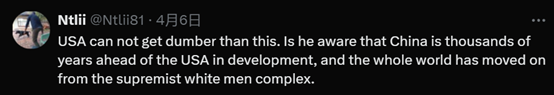 还有网友表示,“美国这番言论简直愚不可及。他不清楚中国在文明发展上领先美国数千年吗?全世界早已摒弃这种白人至上情结了”。
