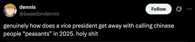 “说真的,2025年了,一个副总统怎么还能称中国人为‘乡巴佬’呢”。