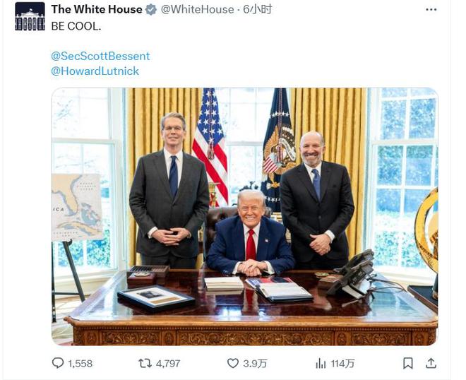 在特朗普宣布关税决定后,白宫贴出了特朗普坐在椭圆形办公室的照片。而在他身后,分别站立着贝森特和卢特尼克。