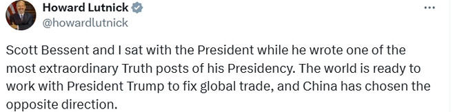 卢特尼克也在X平台上表示:“我和斯科特·贝森特与总统坐在一起,见证了他撰写其总统任期内最非凡的Truth贴文之一。”