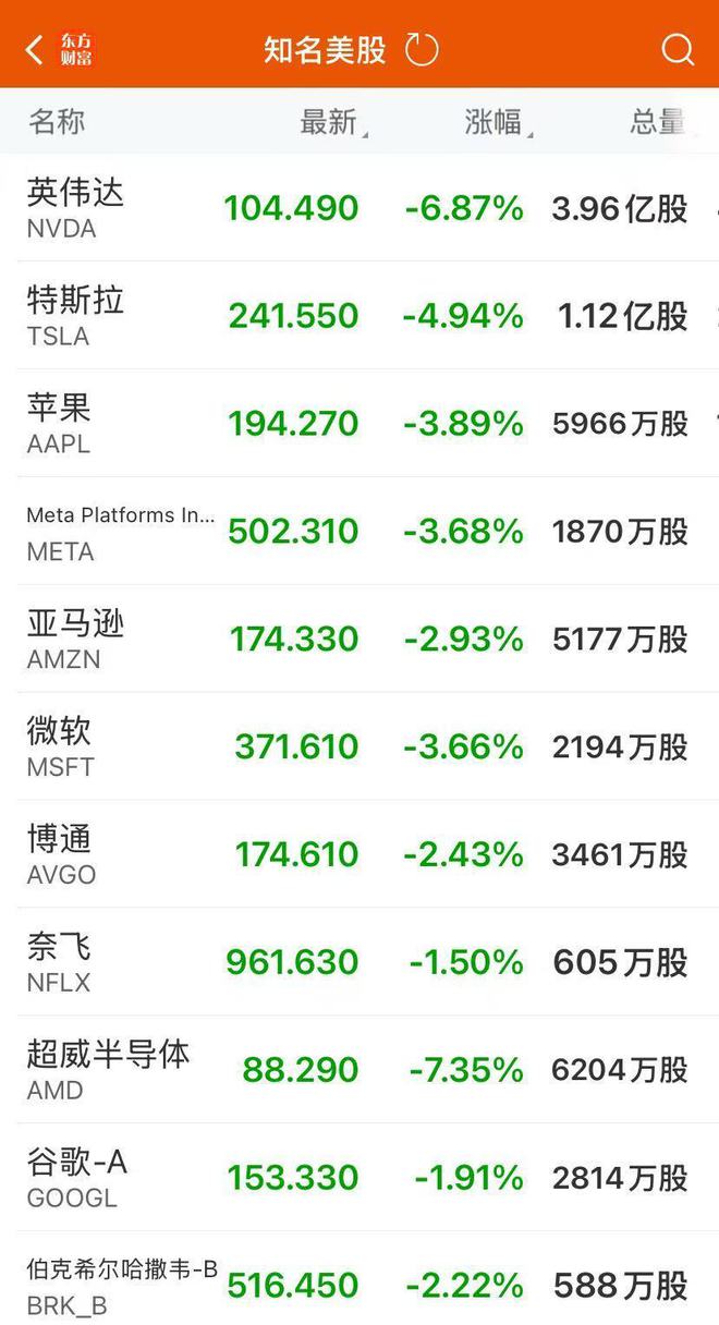苹果跌3.89%,微软跌3.66%,谷歌跌1.91%,亚马逊跌2.93%,Meta跌3.68%,特斯拉跌4.94%。