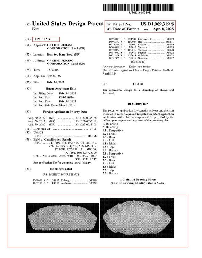 美国专利商标局官网显示,近日,韩国CJ第一制糖股份有限公司(下称“CJ公司”)在美国注册的饺子外观专利,获准通过。