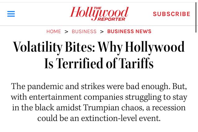这是最近《好莱坞报道者》发表的一篇题为《被不确定性吞噬:为什么好莱坞害怕关税》的报道。