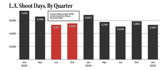 2025年第一季度,洛杉矶地区街道上的外景拍摄总天数为5295天,而去年同期为6823天。相比去年,洛杉矶今年第一季度的拍摄天数下降了22%。