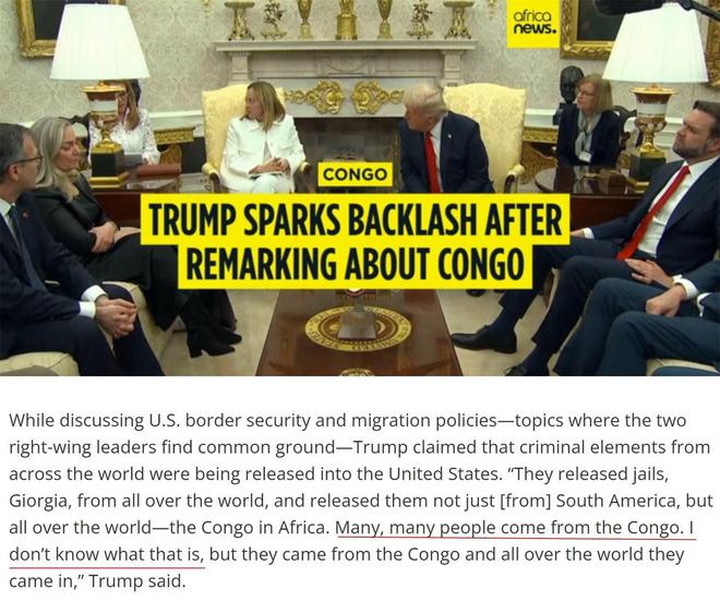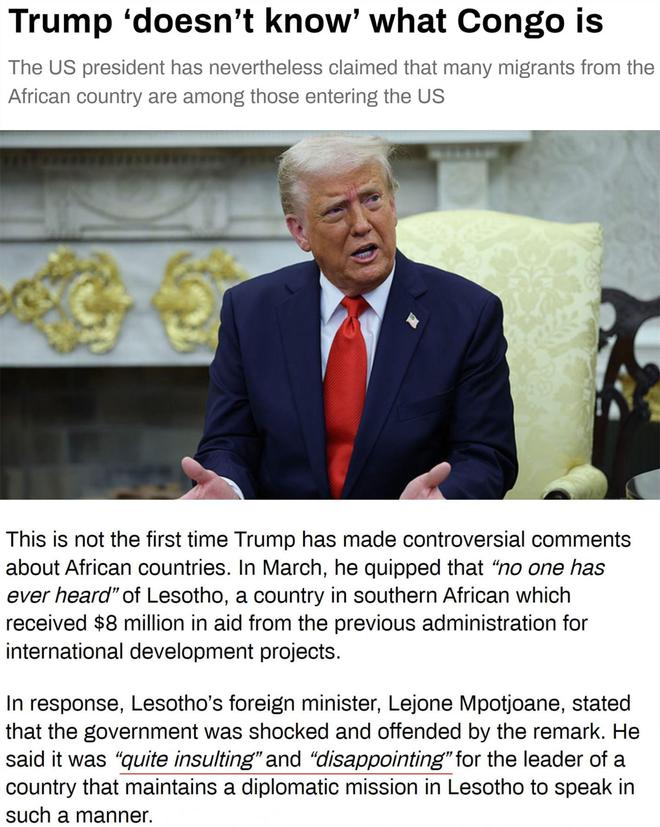 有网友表示:"特朗普谈论一个国家却像描述神秘的丛林生物一样,‘我不知道那是什么’,他描述刚果就像描述传说中的野兽,而不是一个拥有一亿人口的国家。"