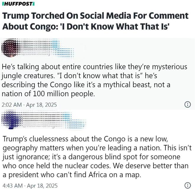 还有网友说:"特朗普对刚果的无知真是破天荒,地理环境对领导一个国家至关重要。这不仅仅是无知;对于一旦掌握核密码的人来说,这是一个危险的盲点。我们不应该有一个不能在地图上找到非洲的总统。"