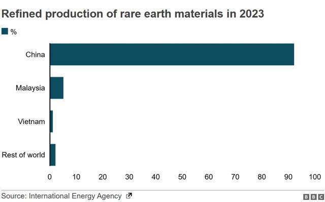国际能源机构的数据称,在2023年,中国的稀土资源产量占到了全世界的61%。更重要的是,中国掌握稀土分离核心技术,全球92%的精炼稀土都产自中国。