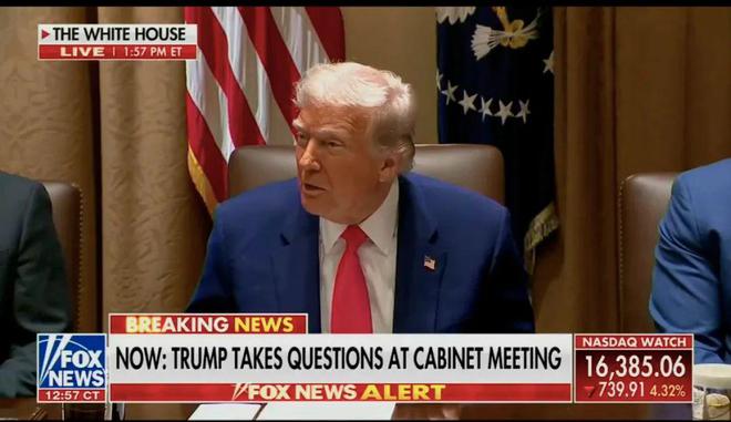 当地时间4月10日,特朗普在内阁会议上发言 图:环球时报援引福克斯新闻视频截屏