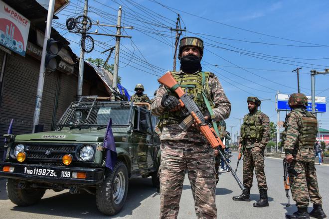当地时间2025年4月23日,印度克什米尔斯利那加,武装部队在著名旅游胜地帕哈根的停业抗议期间保持警惕 图据视觉中国