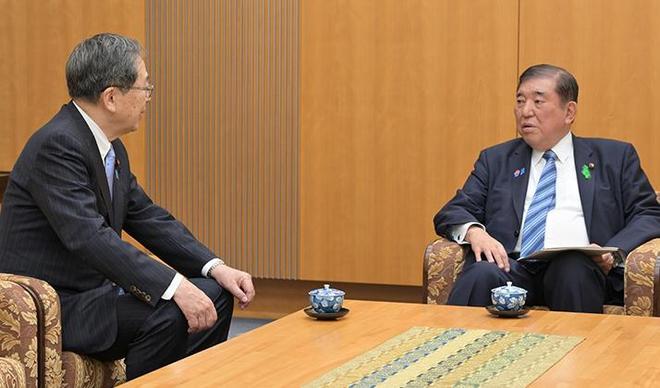 当地时间4月21日,日本公明党党首齐藤铁夫(左)与首相石破茂(右)会面(图/公明党官网)